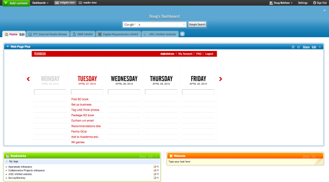 Above is my Netvibes dashboard. As you can see, the Web Page Plus widget is effectively a way to embed an iFrame in order to bring in websites and webapps from elsewhere online. As regular readers know, I’m a big fan of the simple interface sported by TeuxDeux, so have brought that in front-and-centre.
