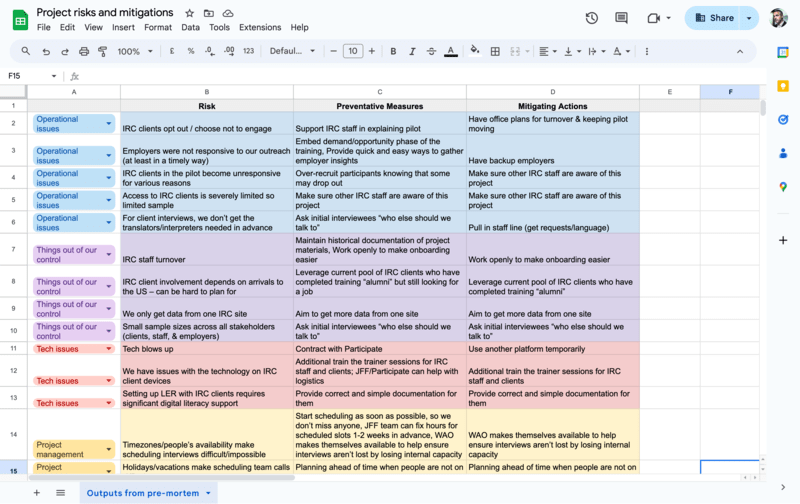 Yesterday, WAO ran a pre-mortem for a new project we’re kicking off. We used Whimsical, but wanted the results to be in a spreadsheet for easy reference. This is the kind of thing that used to take probably an hour of my life and was a boring task. LLMs like GPT-4o make it easy: