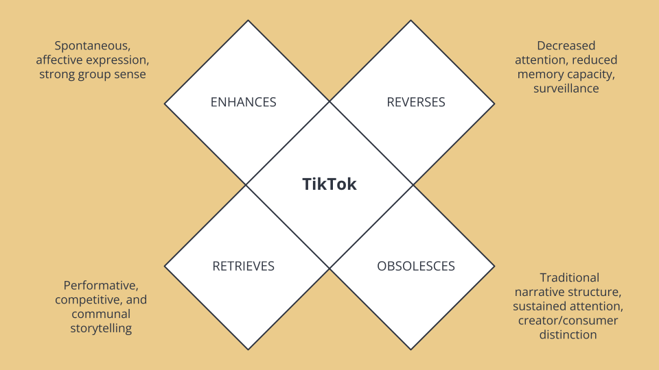 RETRIEVES – Ong talked about pre-literate oral culture having an “agonistic style,” by which he means performative, competitive, and communal storytelling. TikTok retrieves this, along with the television-era experience of passive consumption, despite a veneer of interactivity.
