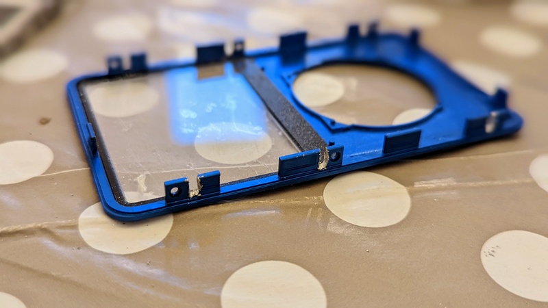 Initially, I wanted a blue metal front casing which is entirely on-brand for me (I wear blue most days and drive a blue car). However, I accidentally bought a 6th-generation version which has clips in slightly different places to the 5th generation. As you can see in the photo below, I took a hacksaw to it, which kind of worked…