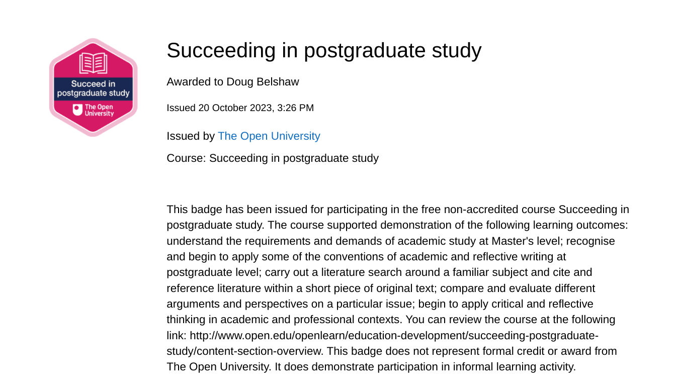 I’m due to start my MSc in Systems Thinking in Practice on November 1st. In preparation for this, the Open University (OU) suggest that I take a short badged open course entitled Succeeding in postgraduate study via their OpenLearn platform. I completed the course today and was issued an Open Badge.
