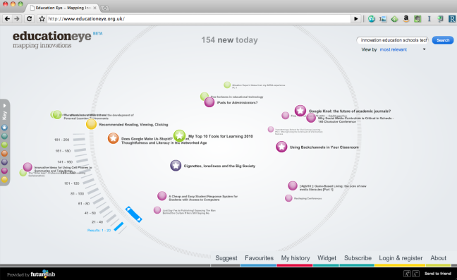 When they launched Education Eye I didn’t really get it. Now I do. RSS feeds pulled in from blogs and news outlets (including, yes, this one) and presented in a very visual fashion. I love the way that the dots are colour-coded according to ‘inspiration’, ‘Policy’, ‘Practice’ and so-on, with certain posts starred as Futurelab staff favourites. Awesome.