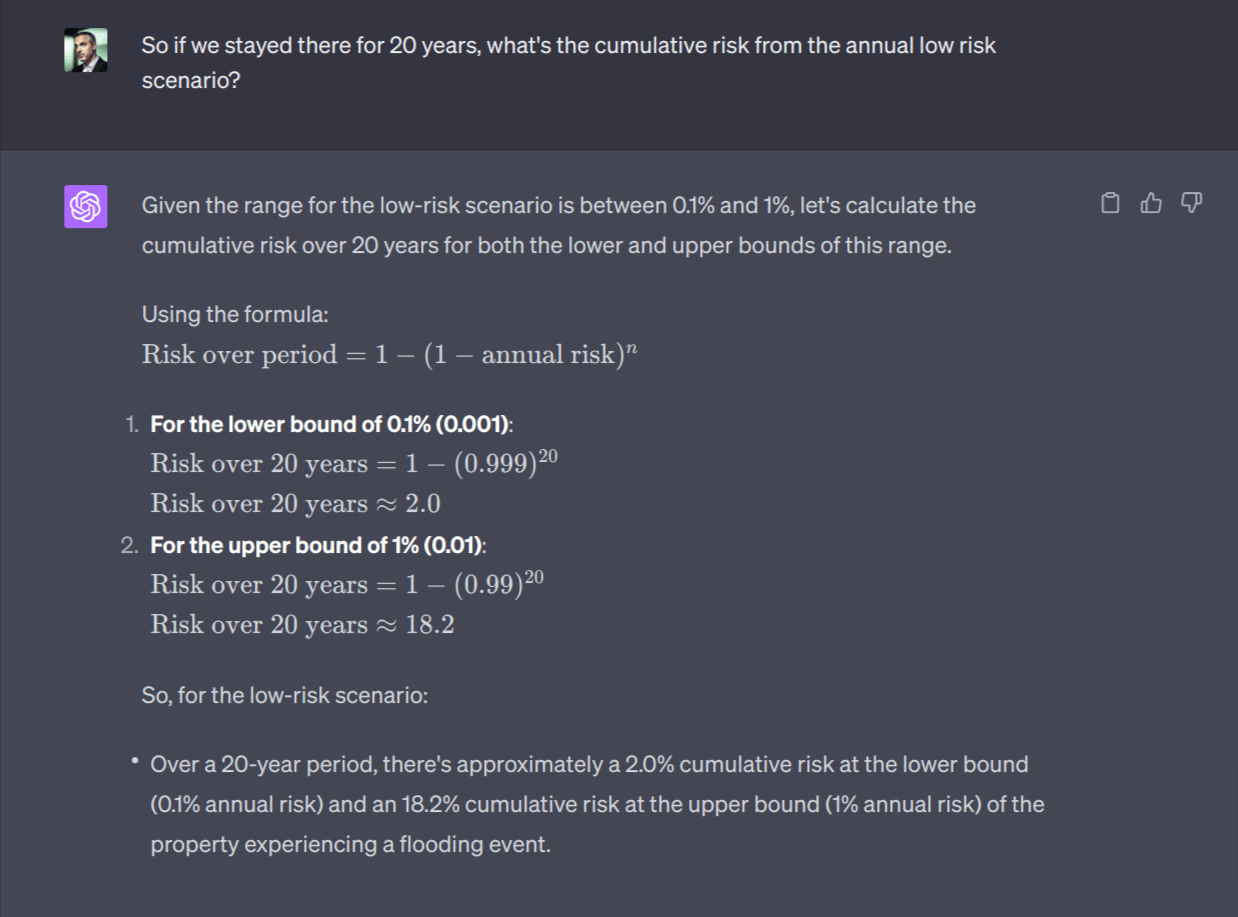 - Over a 20-year period, there's approximately a 2.0% cumulative risk at the lower bound (0.1% annual risk) and an 18.2% cumulative risk at the upper bound (1% annual risk) of the property experiencing a flooding event.](https://blog.dougbelshaw.com/content/images/wordpress/2023/08/chatgpt-flood-risk-2.png)