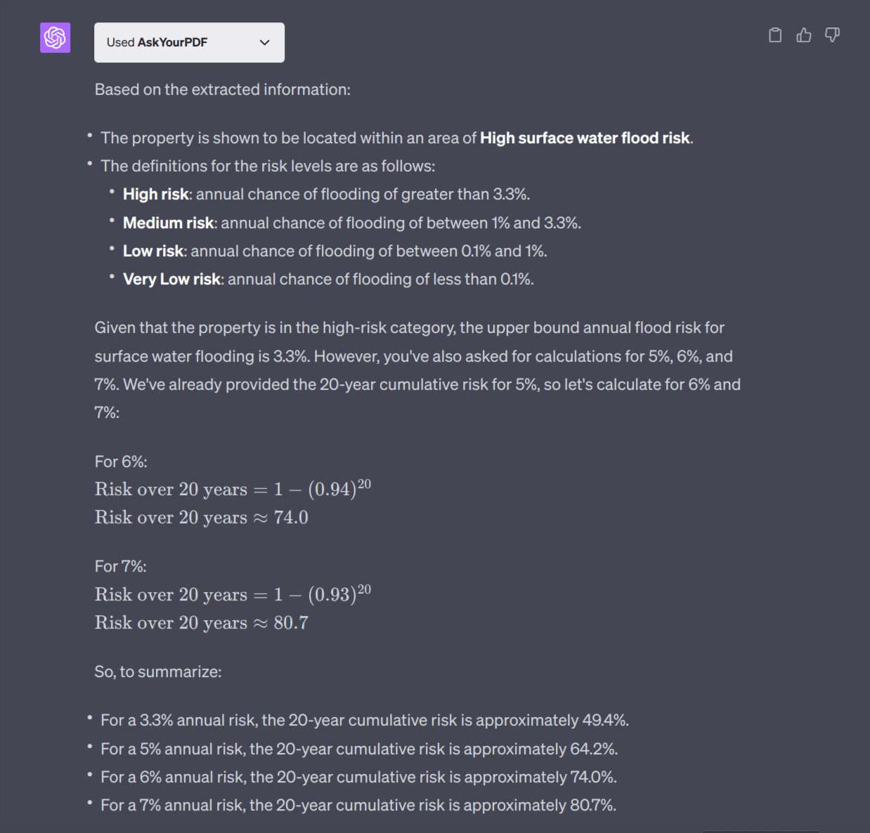 I used the AskYourPDF plugin for ChatGPT, beginning by asking it specifically to explain “in the simplest language possible” the risk from surface water flooding. I then asked if we were planning to live there for 20 years whether it would be a sensible purchase. While it wouldn’t make a specific recommendation, its responses erred on the side of caution.