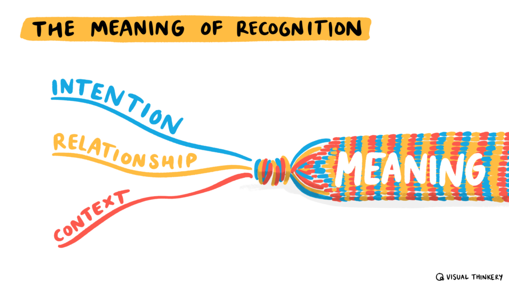 Given we had an image to help understand how to create ‘credible’ credentials, we needed one for recognition. The thing that emerges here is meaning, with that resulting from the intention of the recogniser, the relationship between the recogniser and recognisee, and the context within which that operates.