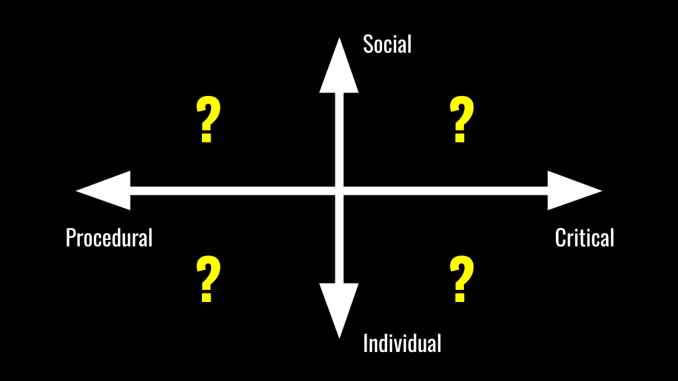 This resonates quite nicely with work I've done around digital literacies. For example, this slide deck builds on work from my doctoral thesis showing how literacies can be plotted on two different spectrums. These can then be mapped against each other, creating four quadrants: