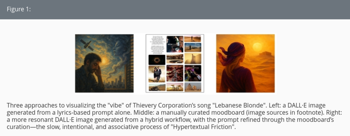 This process became a kind of hypertextual composition, where each image or reference led to the next. Meaning wasn’t just generated—it was curated through a frictive, slow, and intentional process. We returned to DALL·E with a screenshot of the moodboard and short personal narratives written during reflection in Freeform. The resulting image resonated more—not because the model improved, but because the input was shaped by intentional labor. Meaning emerged from the path, not the endpoint. This illustrates how GenAI systems can benefit from hypertextual scaffolding—not to optimize output, but to foreground reflection, authorship, and agency in the creative process.
