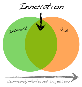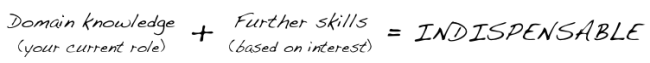 The commonly-followed trajectory is from interest to a job/employment in that area. Which is great. What you need to make sure of, however, is that you don’t lose the relevant, up-to-date domain knowledge (green circle) in your trajectory to the right of the Venn diagram.