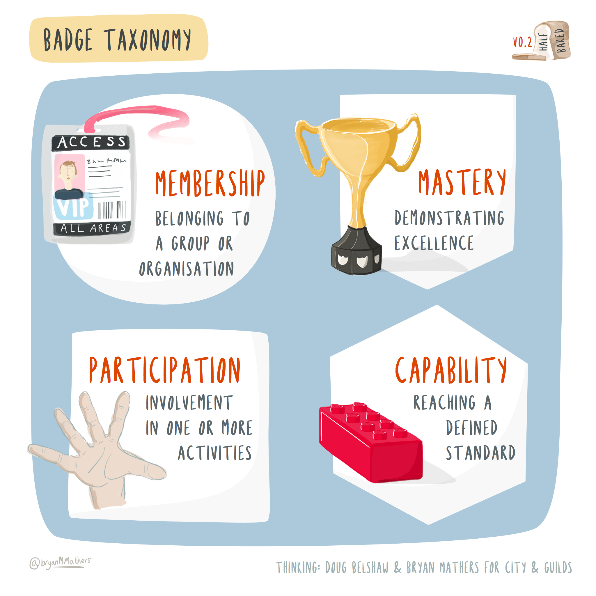 Bryan created this super-simple taxonomy from our conversations as a conversation starter with City & Guilds staff, helping them realise that recognition in the form of participation in something, or membership of a thing, was just as legitimate as reaching a defined standard or demonstrating excellence. Badges help us tell a story about the learning journey we’ve been on.