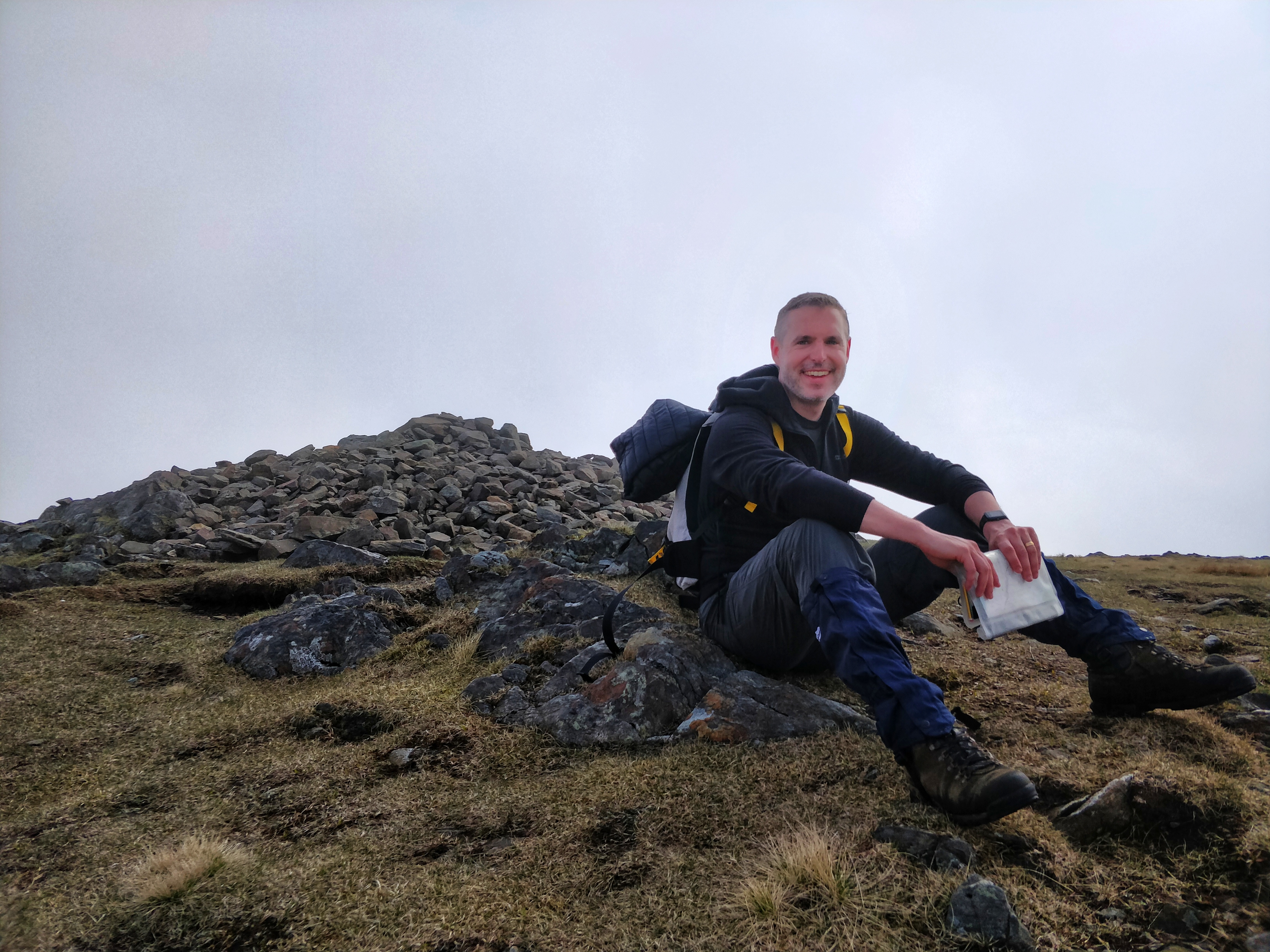 The first peak we ascended on the way to Merrick was Benyallery (719m). There is a cairn at the top, and Hannah took my photo.
