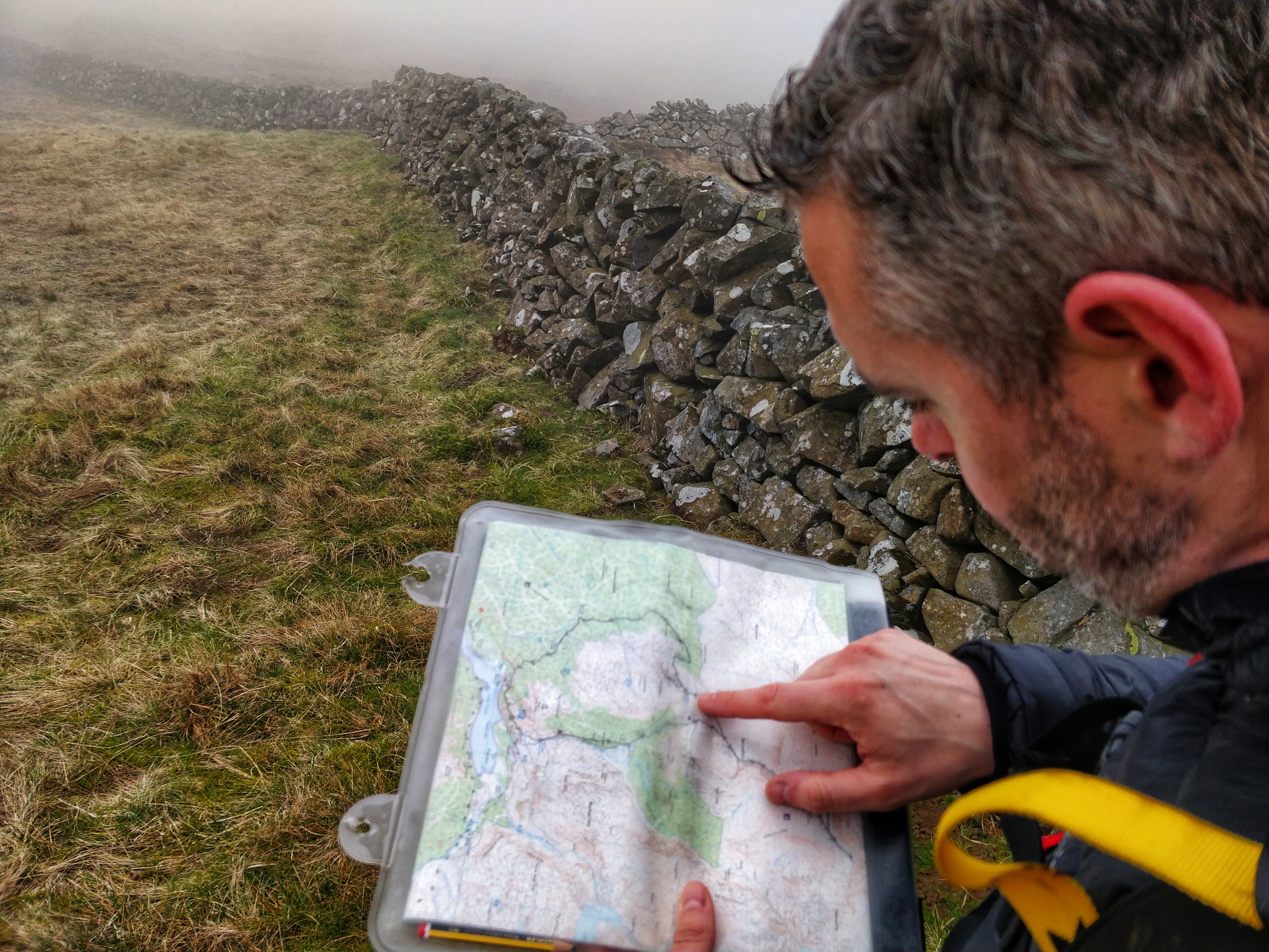 It’s always difficult to know in advance what you’re actually going to discover when you see a black solid line on an OS map. It means a boundary, but fence or wall? In this case, I’d planned to use it as a ‘rail’ to help us down, instead of continuing on the track. That would have added another 5km to our journey.
