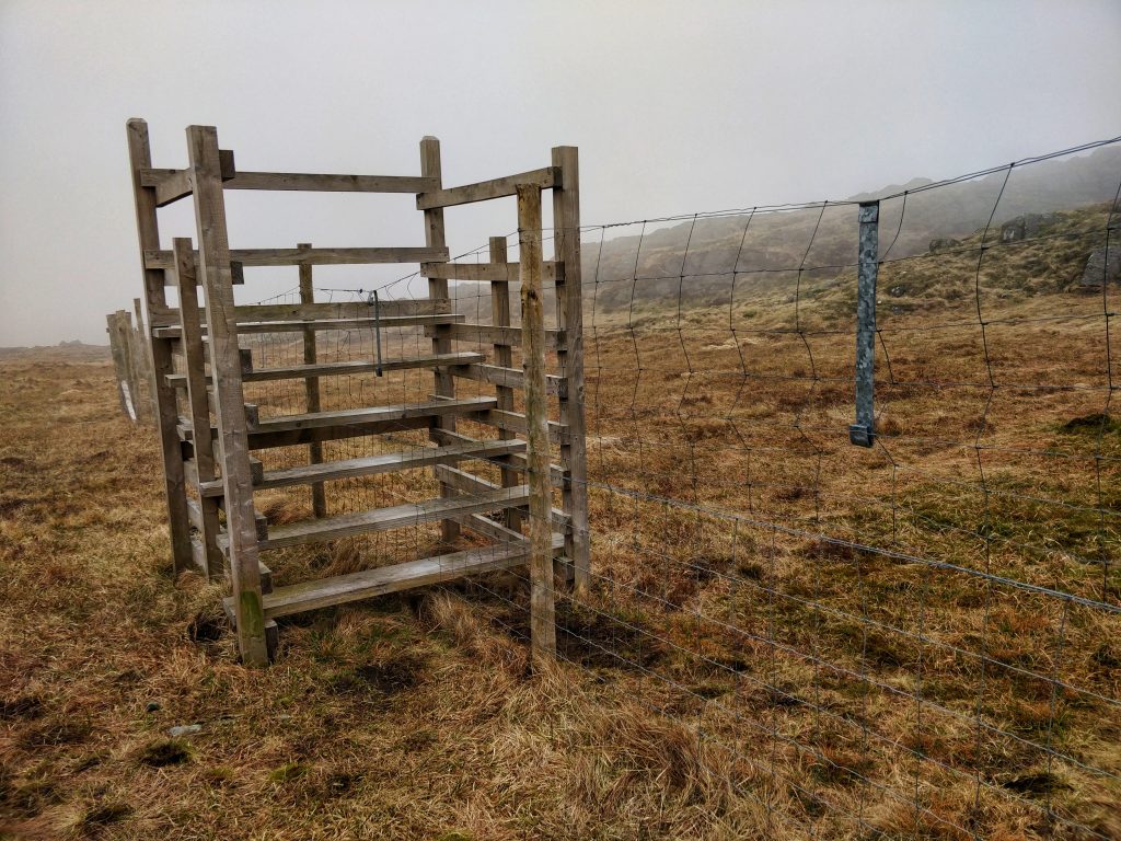 A new, high deer-proof fence had been erected by the Forestry Commission since the OS Map was published. We found a way to cross via the largest stile I’ve ever seen.