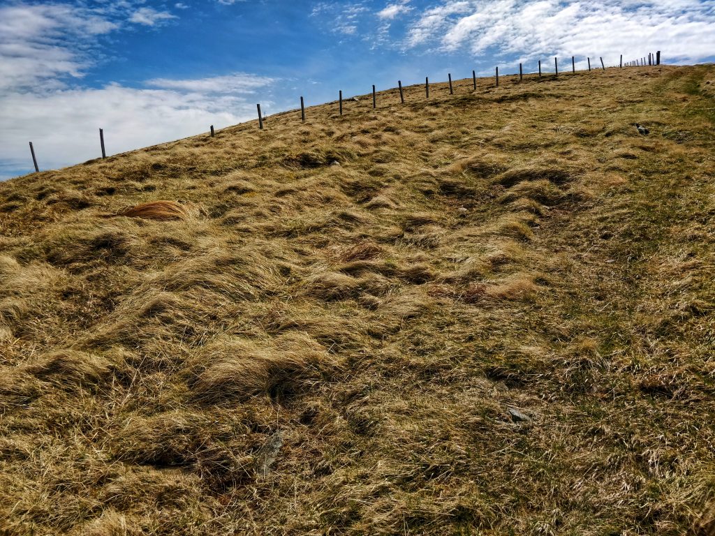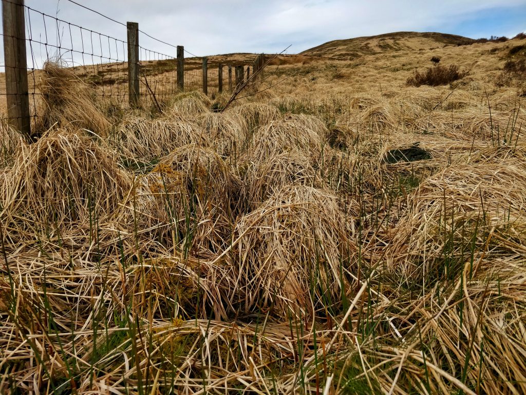 However, instead of going all the way back to the path, I decided that we’d go along by the fence and then join the train. That meant we had to traverse lots of grass hummocks, which was hard going. In fact, this was the least steep of the hills but the most difficult walking.