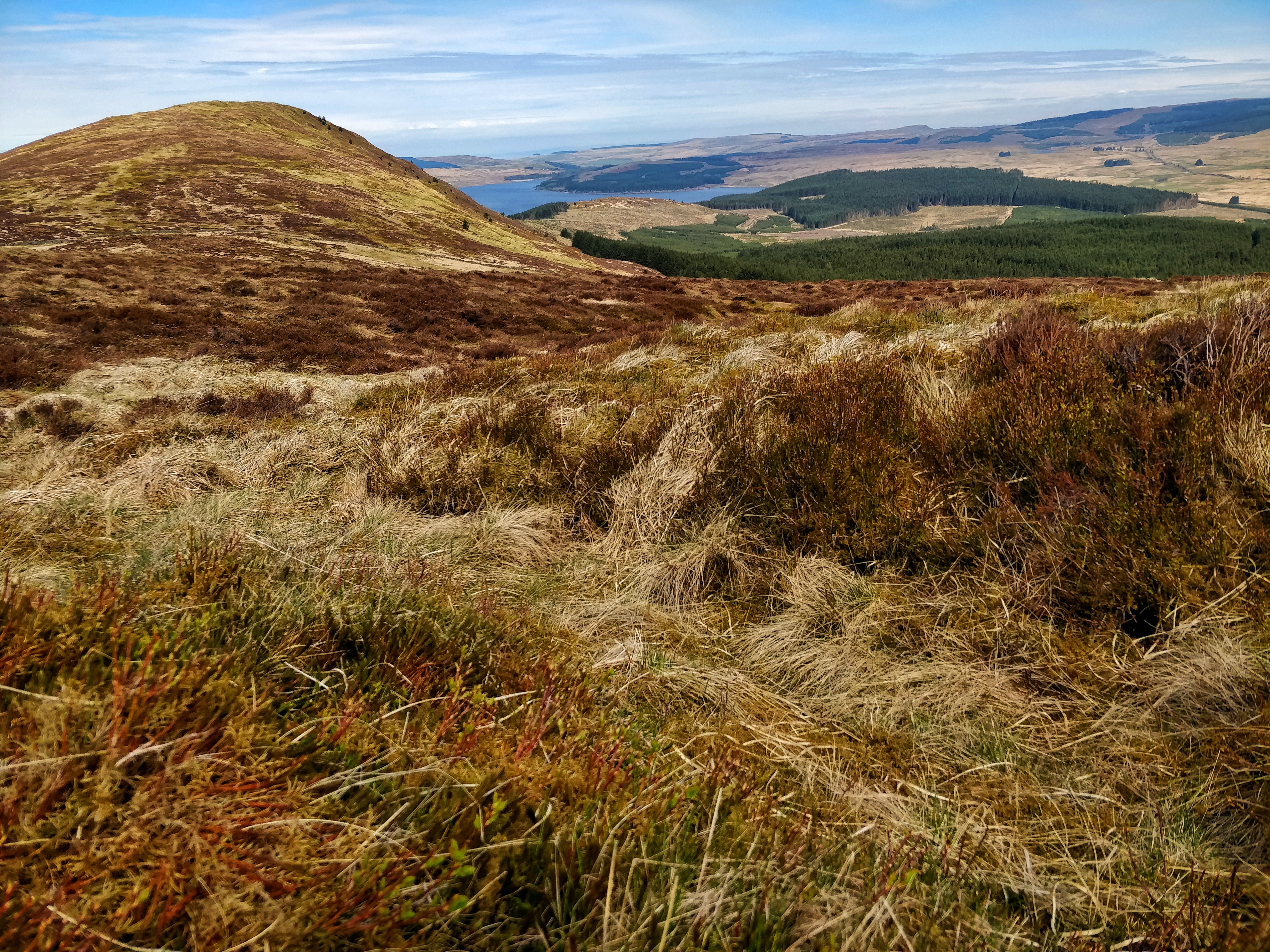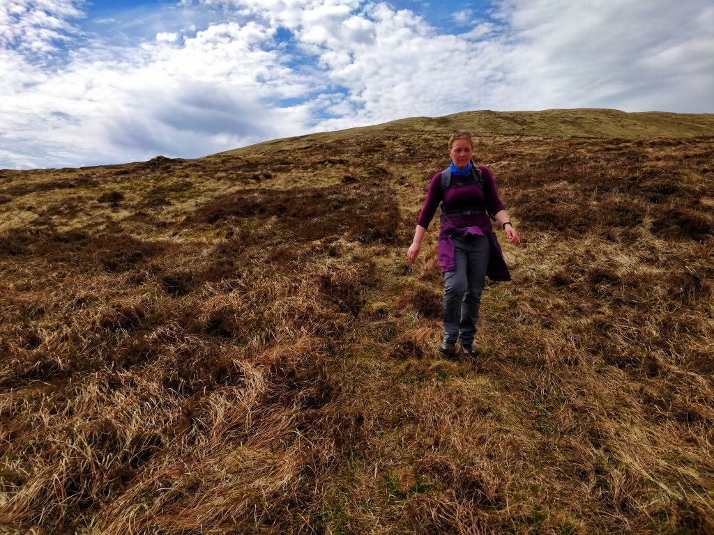 We headed down Knockower and towards Black Craig. This part involved tramping over heather, which was difficult for Hannah’s knee (which was already hurting a bit).