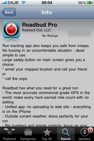 A few months ago, Mike Schoeffler, the developer of a new iPhone running app called Roadbud started following me on Twitter and reading this blog. I ended up joining the mailing list for updates and a free copy of the app upon release. After some delays, it was available in the App Store earlier this week.