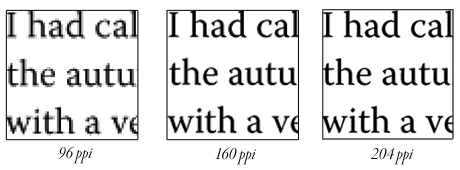 Not only does a TFT screen constantly refresh, but it has a lower pixel density (measured in Pixels Per Inch – or PPI) than a screen using e-ink. As this page on Wikipedia shows, the PPI of my 15.4″ Macbook Pro is 110, whereas e-ink screens are anywhere from 167 up to 200 PPI. A standard 1024×768 monitor could be as low as 75 PPI.