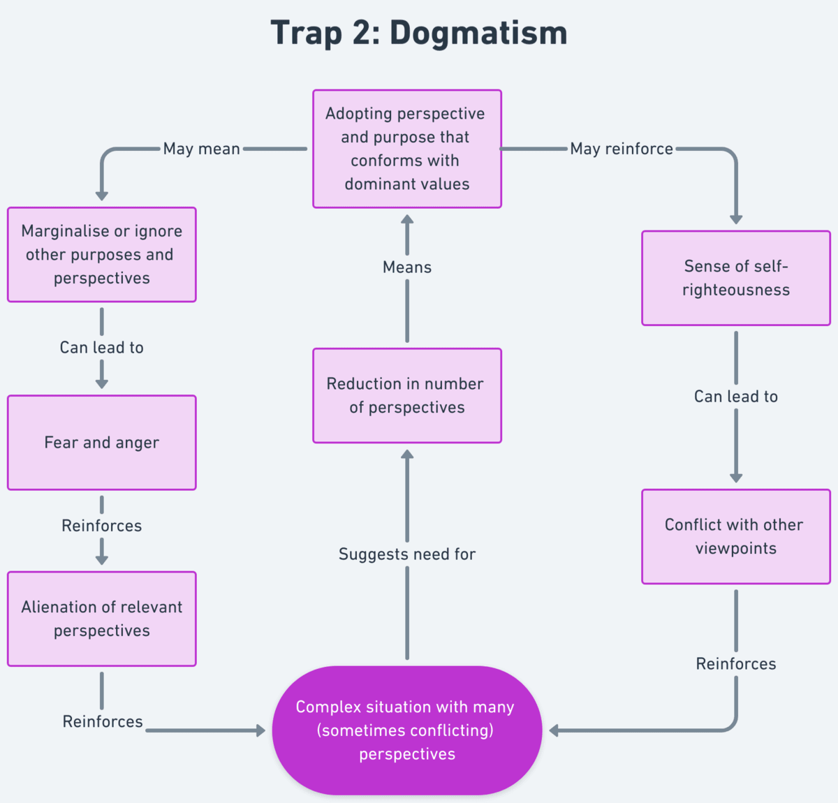[Trap 2] is a concern about the restrictive practice of ‘engaging’ through ignoring other perspectives of the situation. The two approaches that have traditionally addressed this issue are Strategic Options Development and Analysis (SODA) and Soft Systems Methodology (SSM).