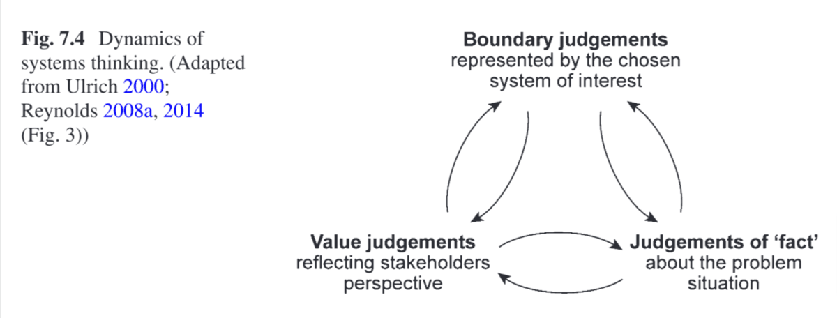 As such, I find Werner Ulrich’s notion of ‘boundary critique’ as part of CSH extremely useful. There is no objective reality to map, so we need to draw a boundary based on a particular view point. Doing so in a way that explicitly notes that this is one among many views is a powerful tool.