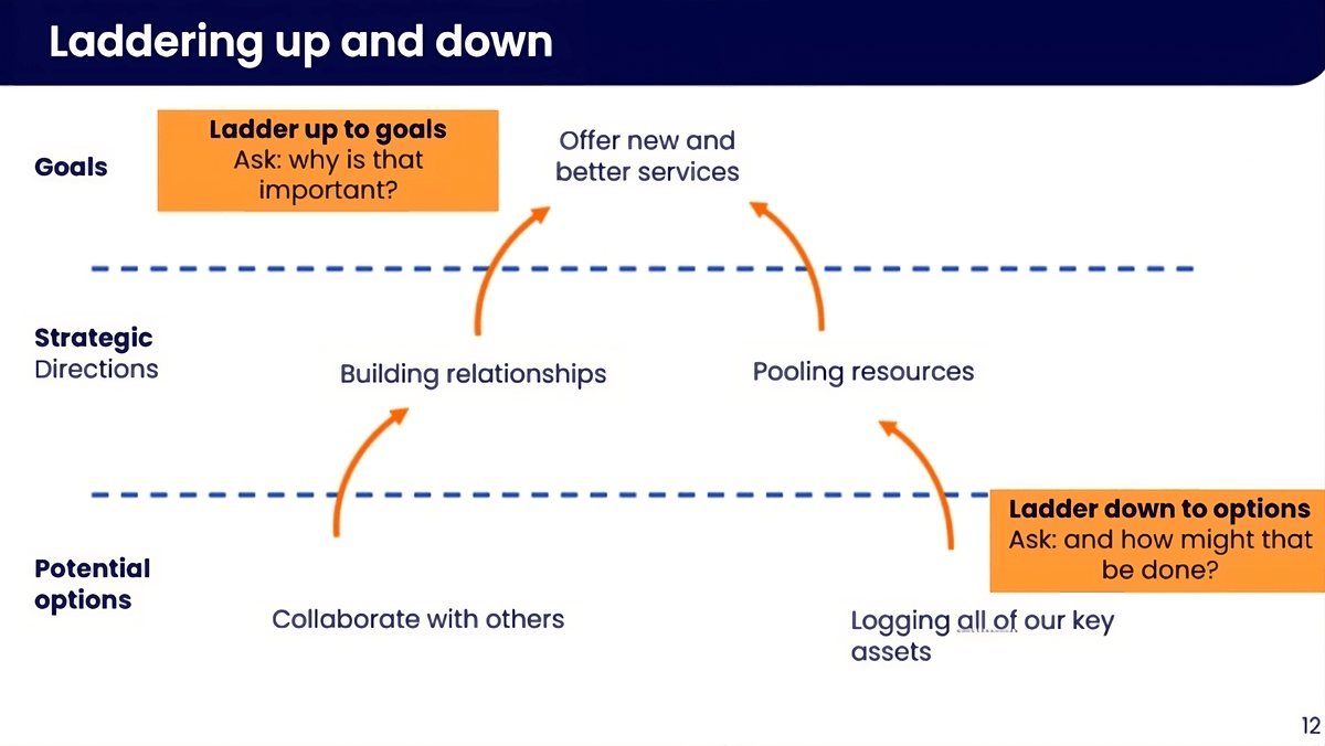 On the other hand, laddering down involves asking “How might that be done?” to move from broad goals and strategic directions down to specific, actionable options. This technique breaks down high-level objectives into practical steps that can be implemented. For instance, if the strategic direction is “Building relationships,” laddering down would involve identifying specific actions that could achieve this, such as “Collaborate with others” or “Develop equality awareness resources and learning events.”