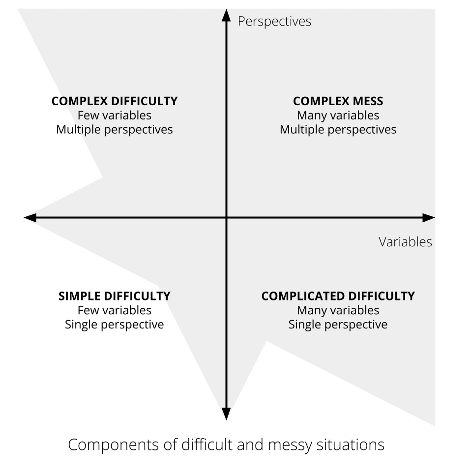 Messes usually have more serious implications; more people are likely to be involved; they include many interlocking aspects and may appear in different guises. As our three stories illustrate, messes usually have a longer time-scale; and they are often more complicated in terms of having many interdependent factors, than a difficulty. In addition to these broad characteristics there is a crucial difference between