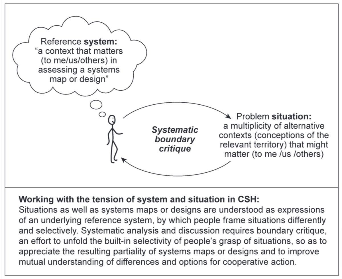 There is likely to be some form of conflict or tension between reference systems which have been created by different individuals or groups. The reflection and discourse that arises from this is important. As West Churchman noted: “we have to maintain the contradiction or else we allow ourselves to be overwhelmed by the consistent” (Churchman 1968/79, p. 229/230, quoted in Reynolds & Ulrich, 2020, p.258).