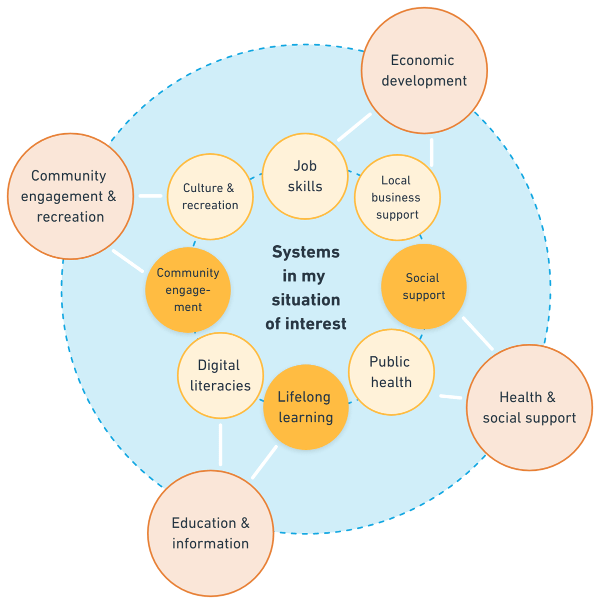 For this module, my area of practice is community development and wellbeing, with my situation of interest being library services. Zooming into that situation, we find a number of systems in play. In the diagram below, I have highlighted (full yellow small circles) the ones I deem most important: