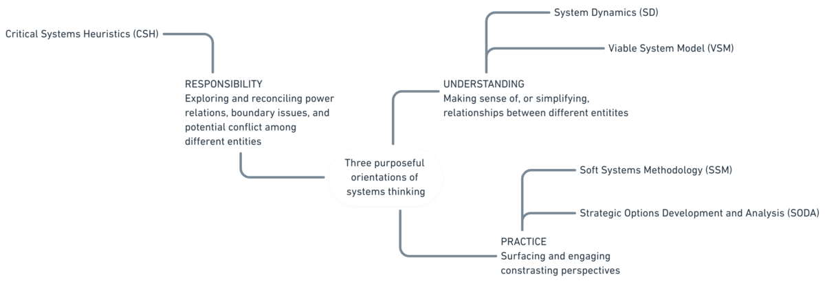 The above spray diagram (Activity 1.11) is my attempt at relating five different systems approaches to three different ‘purposeful orientations’. The idea is that different approaches are useful for different purposes.