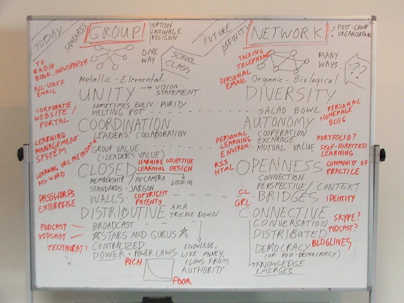 The course materials ask us to reflect on our experiences of being part of communities as opposed to networks. One image that’s stuck with me since 2006 is from Stephen Downes, who drew out the following at a conference in Auckland to illustrate a point he was making: