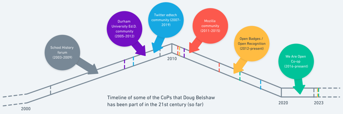 All of this is by introduction to my timeline of the CoPs to which I think I’ve belonged. The timeline is how I see the period from about 2000 to now, in my head. For some reason there’s always a ‘turn’ at the end of a decade. I’m never sure why it goes the direction it does. As my wife says, I’m weird.