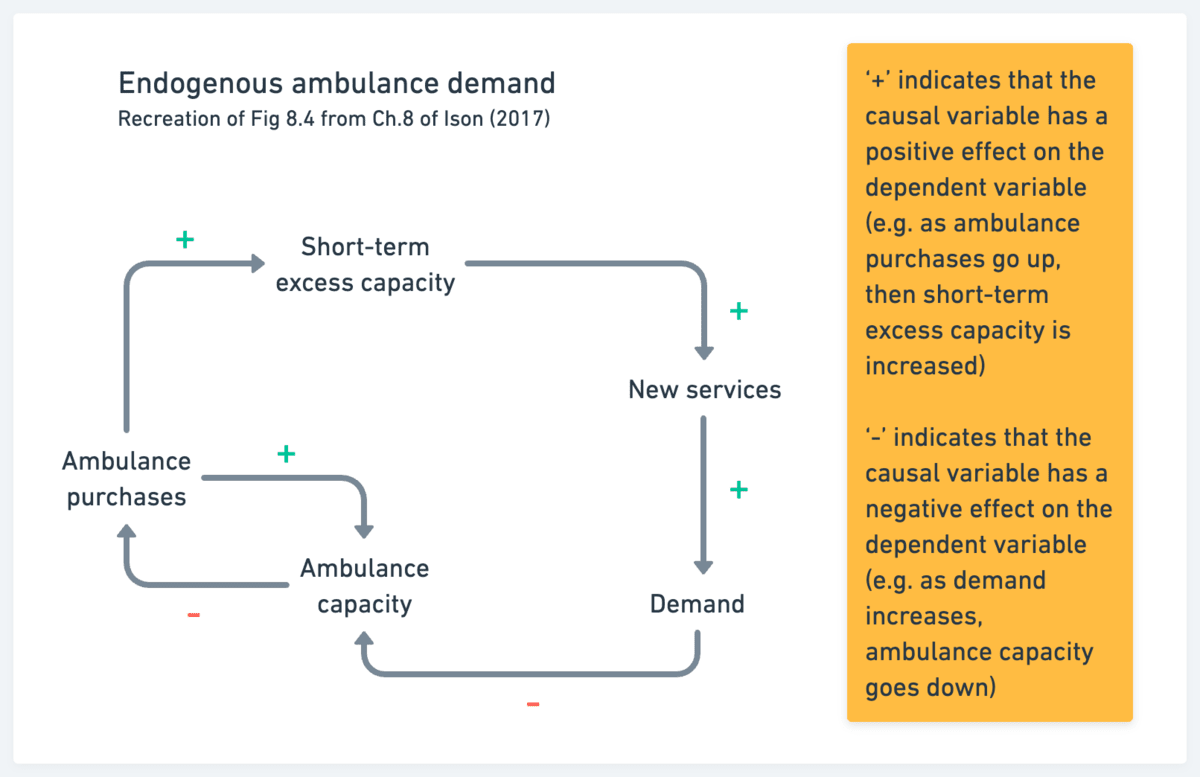 The point that Haslett was making with this story is that “the purchase of the new ambulance had the immediate effect that the ambulance service was under pressure to use the increased capacity” (ibid., p.210). As a result, “expensive and well-equipped emergency ambulances” were used effectively as taxis, which then had the knock-on effect of specialised vehicles taking on some of the workload of less specialised vehicles. The latter then had to find a way to use their excess capacity. As “demand was endogenously driven,” concludes Haslett, “one of the key drivers… [was] the provision of an increasingly range of services from the emergency service itself” (ibid., p.211).