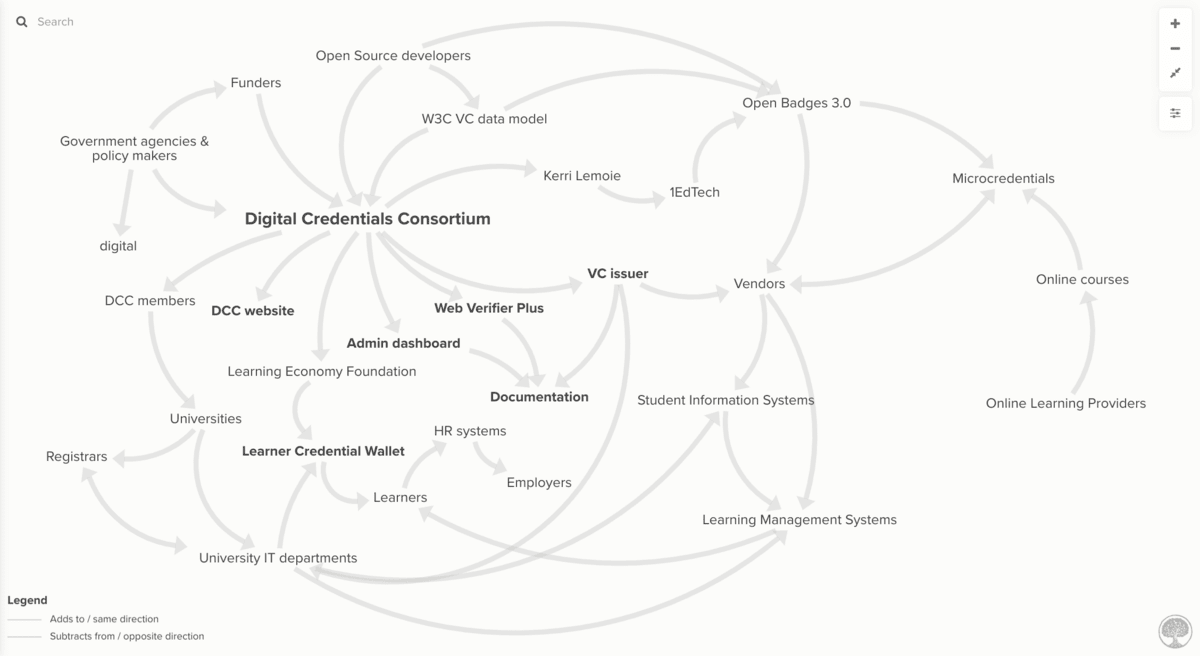 This afternoon, I’ve been working on mapping the ecosystem around the Digital Credentials Consortium. It’s unfinished, but has already been useful in terms of generating insights and stimulating thoughts.