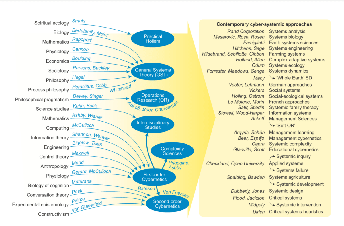 There are some familiar names on there, some of whom I’ve studied (e.g. Hegel, Heraclitus, Whitehead, Dewey, Singer, Kuhn, Peirce) and some whose work I’ve encoutered in passing (e.g Mead, Meadows, Checkland). The rest are, as far as I’m aware, entirely new to me. What’s exciting, especially given my background in Pihlosophy, is that there are so many traditions which feed into what Ison calls ‘Cybersystemics’. He notes that it’s paradoxically both “a discipline in its own right, but also a transdisciplinary metadiscipline, applicable across all domains of human activity – a bit like mathematics”.