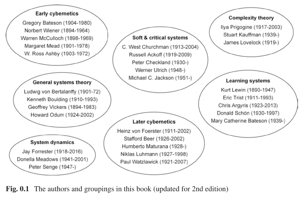 Most of our thinkers are either from North America or Europe, and indeed most of the mainland European thinkers have worked in North America (many as part of the large migration by academics from central Europe in the 1930s and 1940s due to Nazi persecution and post-war hardship). Our stance partly reflects our need (due to our own limitations) for authors to have written or been translated into English, but also reflects the intellectual tradition we have considered, which largely arose in the USA with a significant British connection. There are many interesting systemic thinkers from outside this group, and the systems thinking traditions we discuss would be richer for hearing their voices, but this is not something we have been able to do in this work.