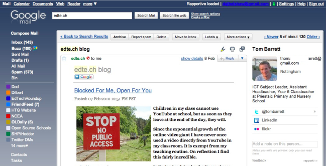 - Rapportive is a plugin for Firefox or Chrome that replaces the adverts in GMail with some contextual social media information about the people who send you email: