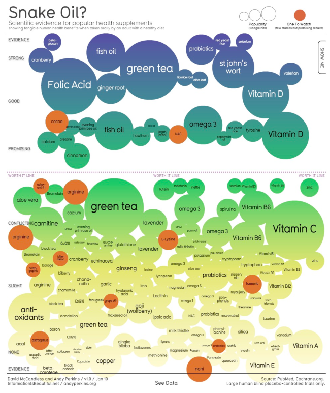 - This is not only a beautiful visualization, but extremely useful: Snake Oil? The Scientific Evidence For Popular Health Food Supplements