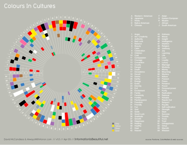 - This graphic by David McCandless ended up adorning his book Information is Beautiful. It shows what colours are associated with in different cultures. As you’d expect, white is associated with ‘truce’, red with ‘passion’ and yellow with ‘illness’ pretty much universally: