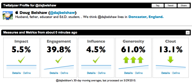 - Twitalyzer produces nice graphics related to the stuff you do on Twitter (it thinks I’m generous, which is nice – and live in Doncaster, which is wrong…)