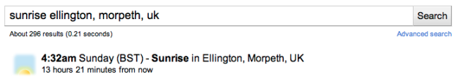 - From the Google-can-do-more-cool-stuff-than-I-can-keep-up-with department comes the news that you can quickly and easily find sunrise and sunset times.
