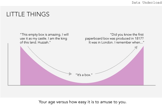 - Nathan Yau of FlowingData has a ‘data underload’ series at the moment. I liked this one on what it takes to amuse us at different ages: