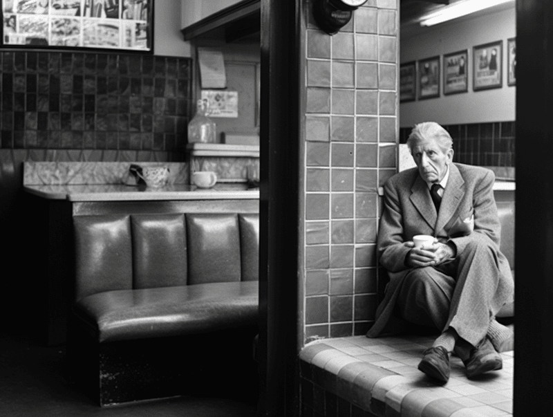 I created in somewhat by accident while messing about in Midjourney last night. That’s the great thing about any kind of tool: it allows you to go beyond your own powers. In this example, I leaned into the ‘old man sitting in the corner’ vibe and started to channel social documentary photographers.