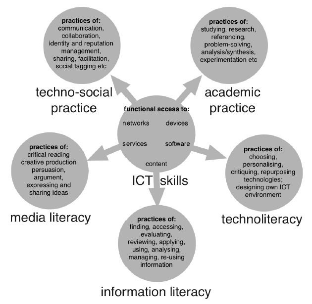 Our focus instead should perhaps instead be upon a particular literacy as an ‘integrating (but not overarching) concept that focuses upon the digital without limiting itself to computer skills and which comes with little historical baggage’ (Martin, 2006 quoted in Bawden, 2008:26). Here Martin seems to have in mind the concept of ‘digital literacy’ although it is not the name of the term that is the issue. Instead, it is its explanatory power and utility in terms of conceptual understanding and applicability that is key.
