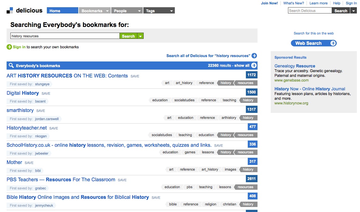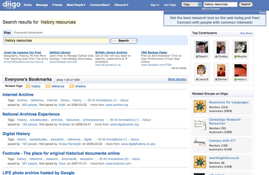 Have a go right now. Head over to Delicious and Diigo and type in the name of your subject followed by resources. Click to enlarge the images below which show the results I obtained when entering history resources!