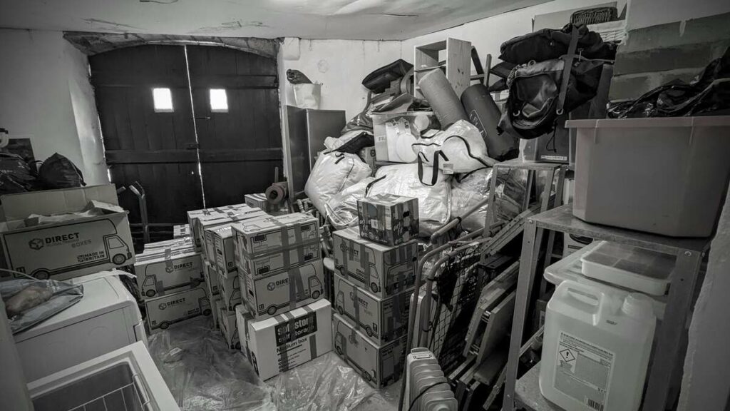 Image: boxes and other things ready to move in the ‘cellar’ of the 17th century coach house we’re currently renting.